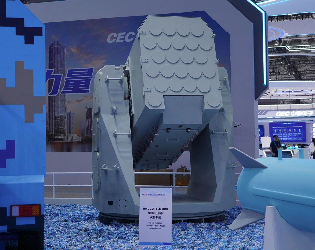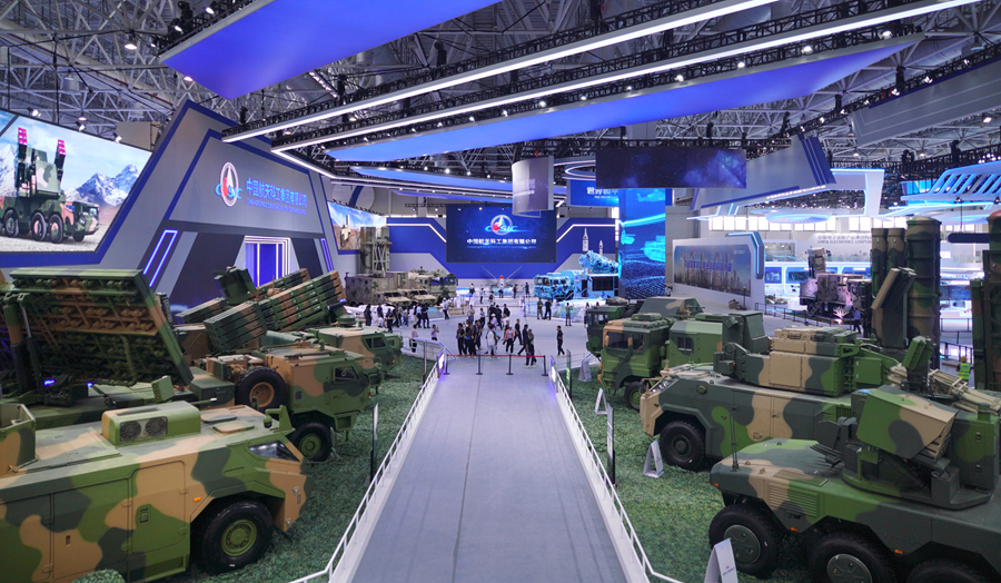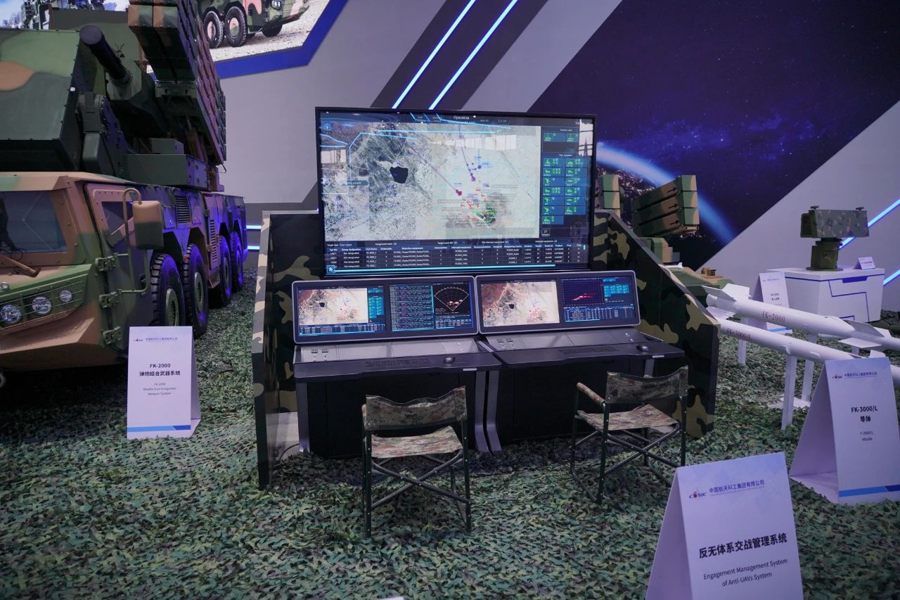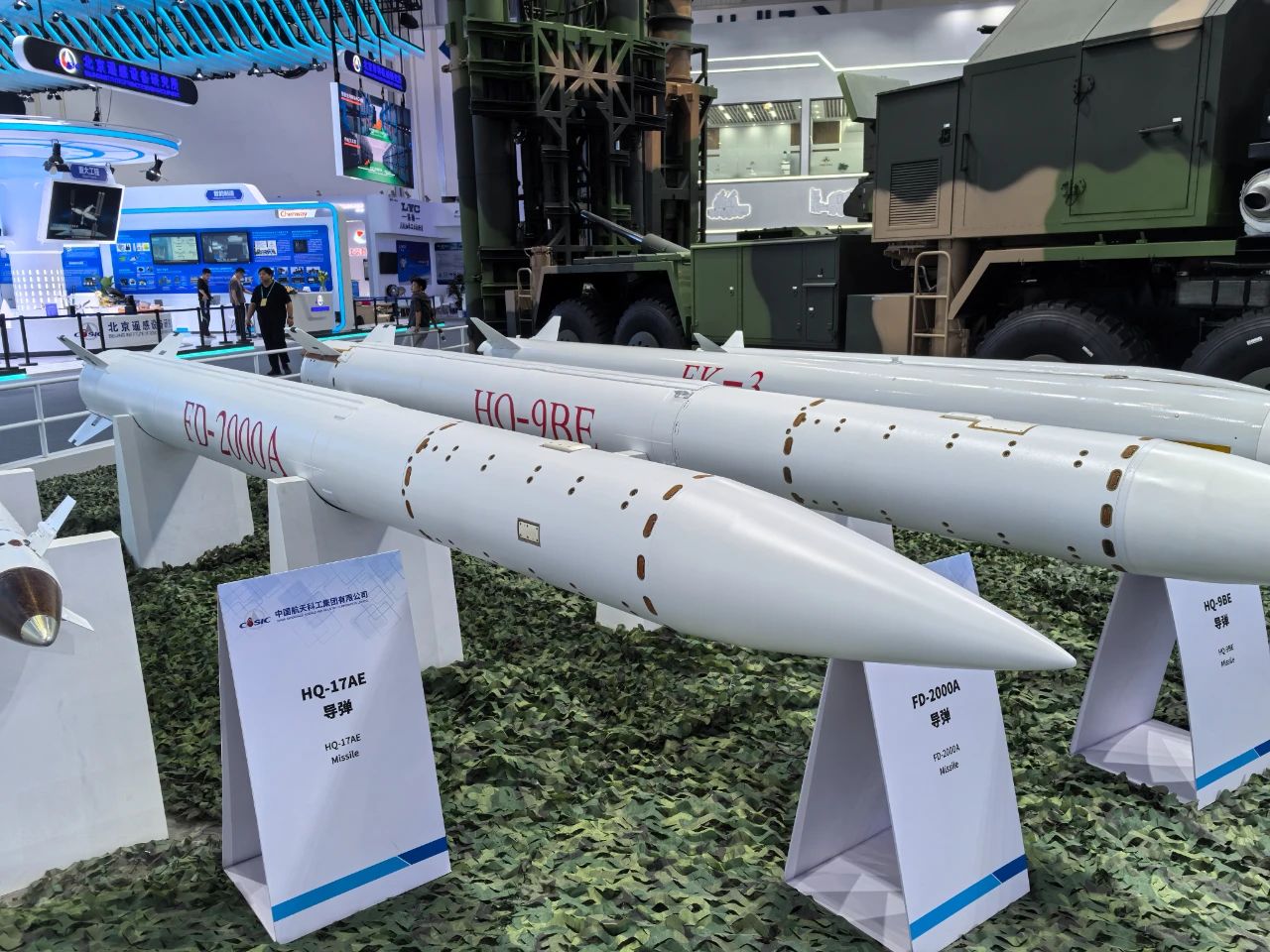 在中國(guó)航天科工集團(tuán)有限公司防空體系展區(qū),HQ-9BE遠(yuǎn)程防空武器系統(tǒng)、FD-2000A中遠(yuǎn)程防空武器系統(tǒng)、FK-3中遠(yuǎn)程防空武器系統(tǒng)、HQ-17AE近程防空武器系統(tǒng)等“明星裝備”煥新亮相。