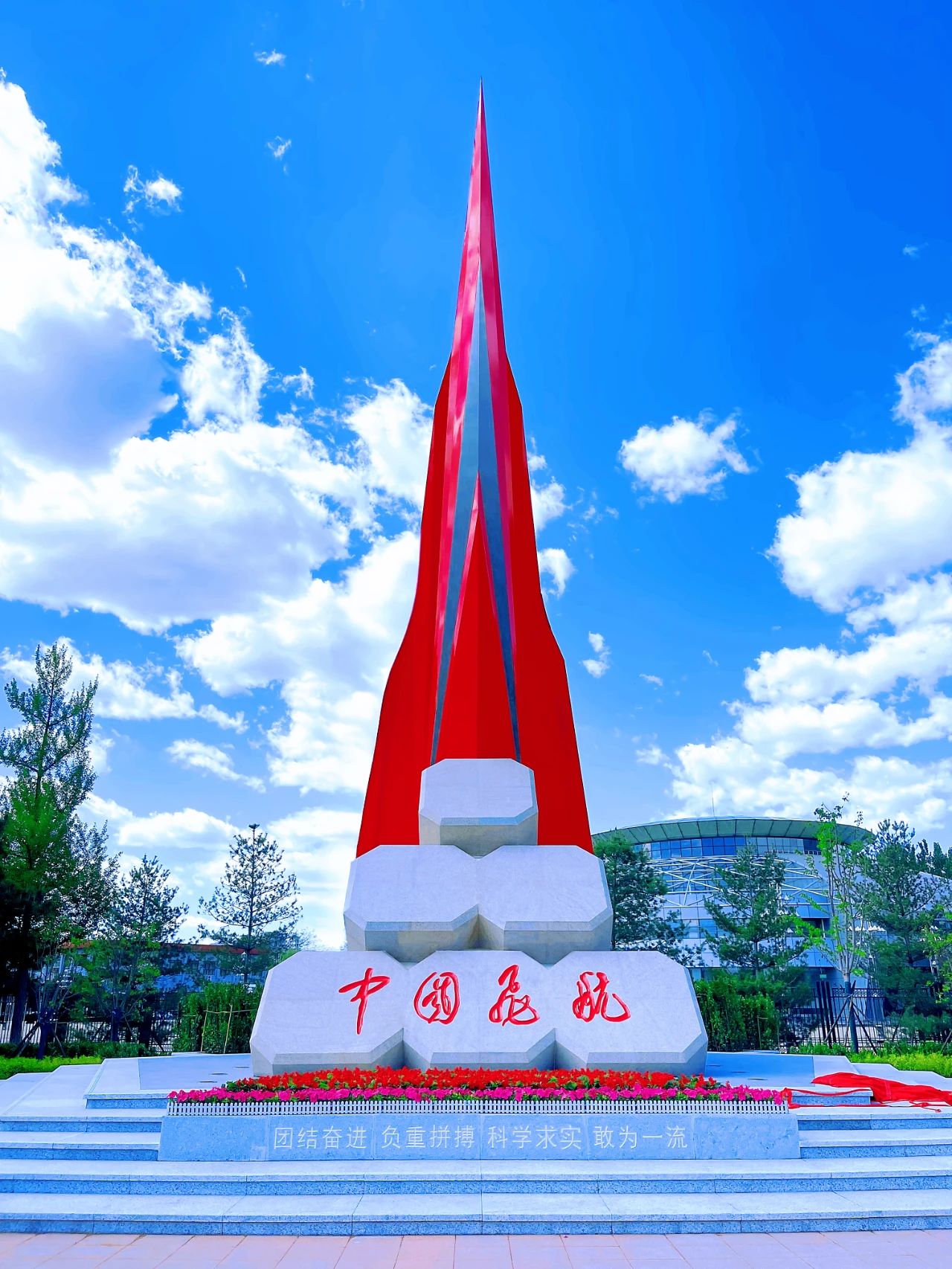 雨后初霽,碧空如洗。在三院辦公樓前廣場東南側,“中國飛航·超越”雕塑巍然聳立,形如未來飛行器,在厚重的石基之上蓄勢待發、昂首蒼穹。