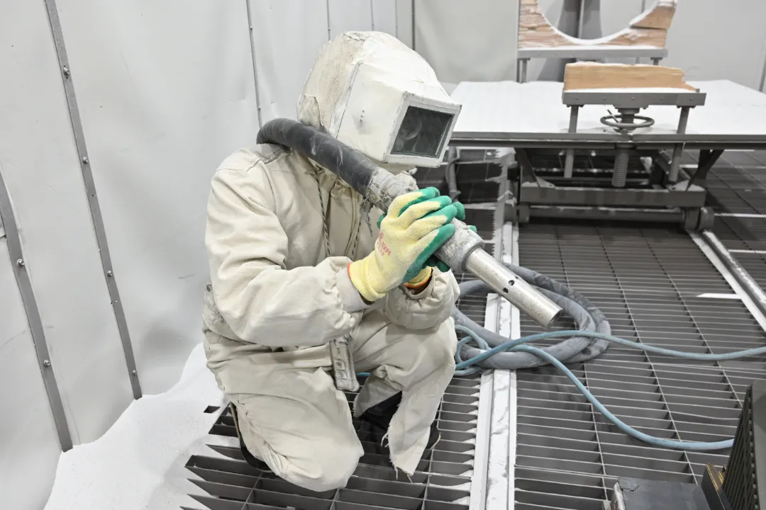 七月以來,暑氣漸顯。為保證噴砂工序生產進度,紅陽公司特種制造部職工穿戴重達10斤的防護服,進入無空調降溫的密閉噴砂間作業。這種環境下,他每隔15分鐘就要擦拭被汗水浸濕的防護服目視窗口,以確保噴砂產品表面質量合格。(圖文/胡卓立)