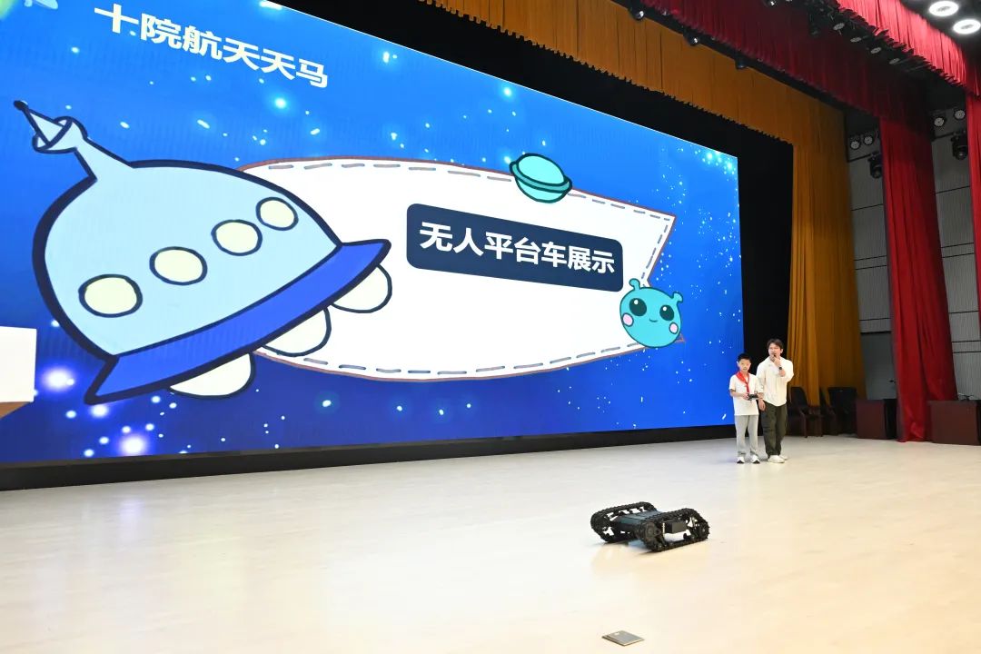 “同學(xué)們,你們知道火箭是怎么飛上天的嗎?”在活動(dòng)現(xiàn)場,十院十部青年講師石龐從一個(gè)問答開始,為小朋友們帶來了一場趣味橫生的航天科普課堂。“中國外骨骼可以幫我抬腿!”“看!那個(gè)無人車可以上樓梯!”十院航天天馬無人平臺(tái)車和十院航天控制外骨骼展示,瞬間點(diǎn)燃了現(xiàn)場氛圍。