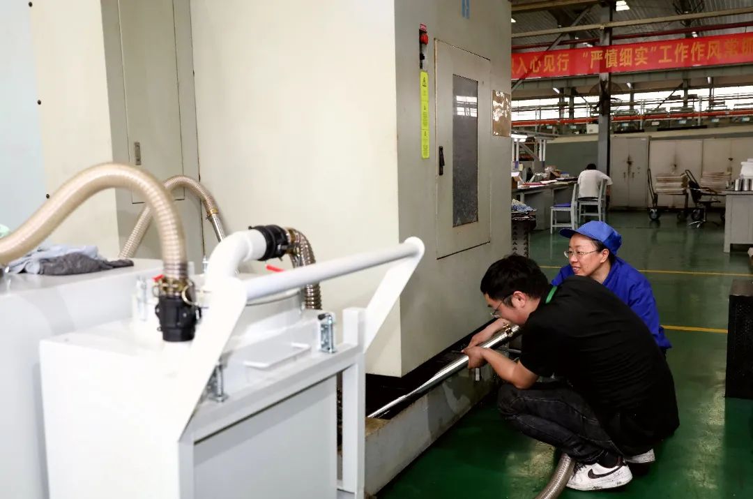 在大廳的另一側,車工小楊正認真地跟設備廠家人員學習清洗機床切削液。數控機床作為生產的關鍵設備,其運行狀態直接影響生產節奏。為確保其“健康”,該公司不惜投入重金,購置清洗機和凈化機,有效解決了設備維護保養耗時耗力、清理不徹底的難題。