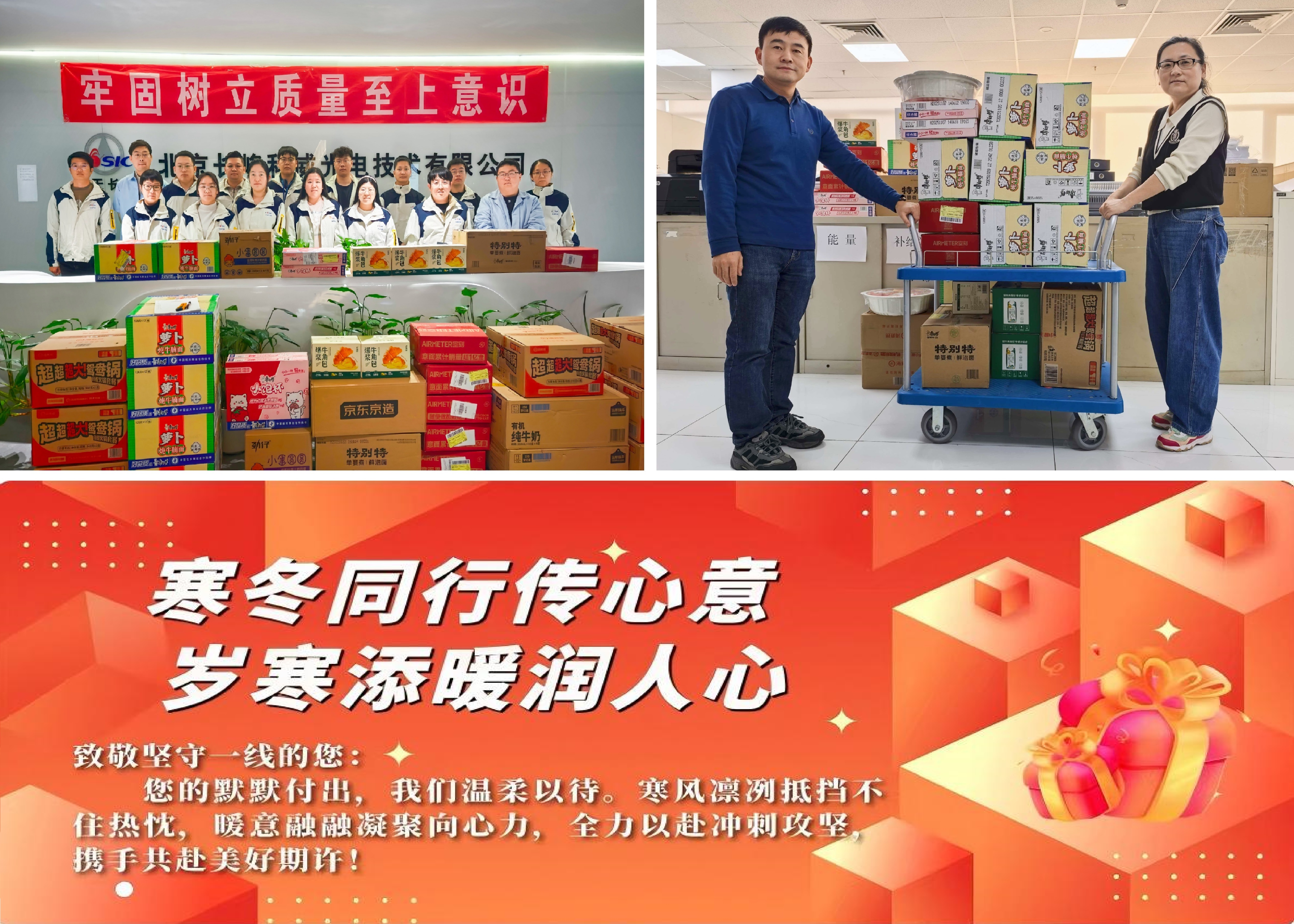 進(jìn)入沖刺階段,公司工會王譞主席帶隊(duì),為一線職工送去品類豐富的慰問食品。解決小餓小累的“小飽杯”,可供團(tuán)隊(duì)一起分享的“超超超大號”鴛鴦自熱火鍋,傳統(tǒng)的牛腩面,滿足嘗鮮味蕾的免煮式意面……公司工會嚴(yán)選高品質(zhì)慰問食品,體貼守護(hù)寒冬里“舌尖上的幸福”。此外,公司工會還向京外地處偏遠(yuǎn)、天氣寒冷的項(xiàng)目駐地一線職工們發(fā)放一批“冬送溫暖”慰問品,把溫暖揣進(jìn)每一位奮斗者的口袋里。