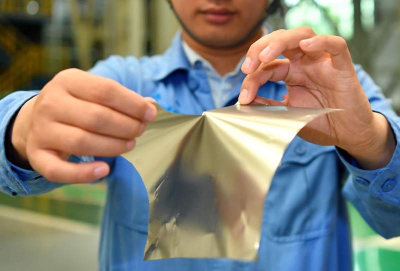 在位于山西的太鋼集團(tuán),員工展示用手撕開0.02毫米厚的超薄帶狀不銹鋼(2019年5月24日攝)。新華社記者 曹陽 攝
