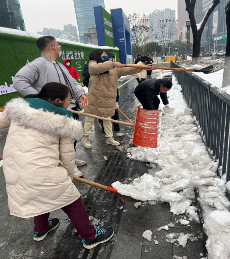 近日,武漢出現(xiàn)寒潮、低溫雨夾雪等冰凍天氣,道路積雪濕滑,給市民出行帶來(lái)了極大不便。為有效應(yīng)對(duì)雨雪冰凍天氣,全力保障道路暢通和群眾出行安全,中國(guó)航天科工財(cái)務(wù)公司武漢分公司黨支部積極組織黨員和志愿者參加了由廣發(fā)銀行大廈黨委和北湖街道共同組織開展的“微光成炬 益匯江漢”掃雪除冰志愿服務(wù)。