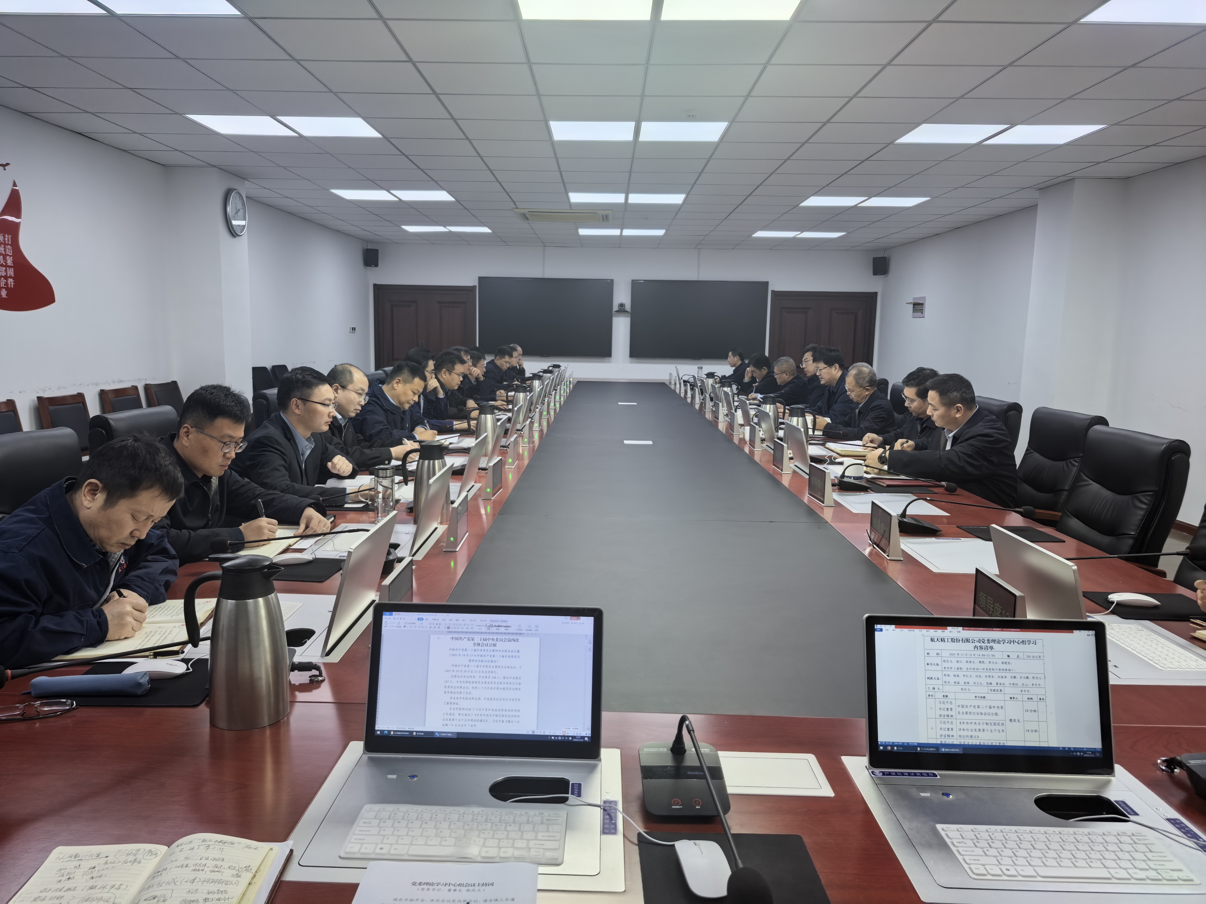 11月12日,航天精工黨委召開理論學習中心組集體學習,專題學習研討黨的二十屆四中全會精神。航天精工黨委書記、董事長程慶文主持會議,黨委成員結合學習內容和分管領域進行交流研討,本部各部門(機構)負責人列席會議。
