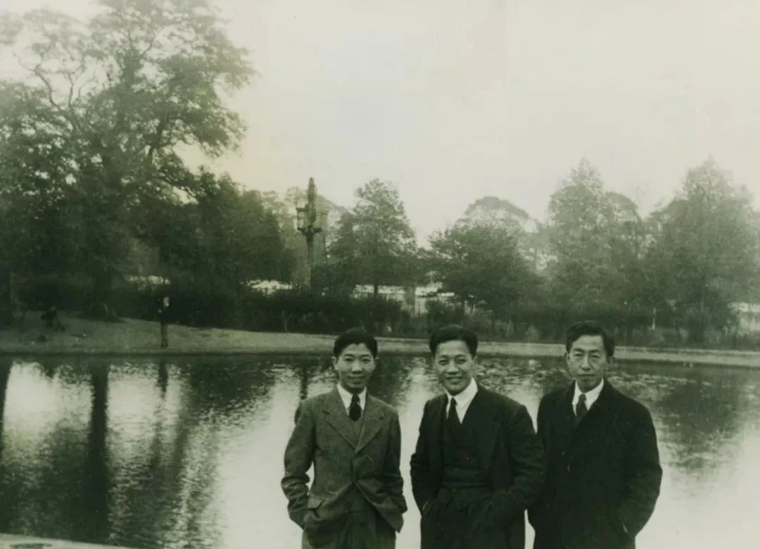 1946年,黃緯祿(中)在英國倫敦住所附近與室友合影。