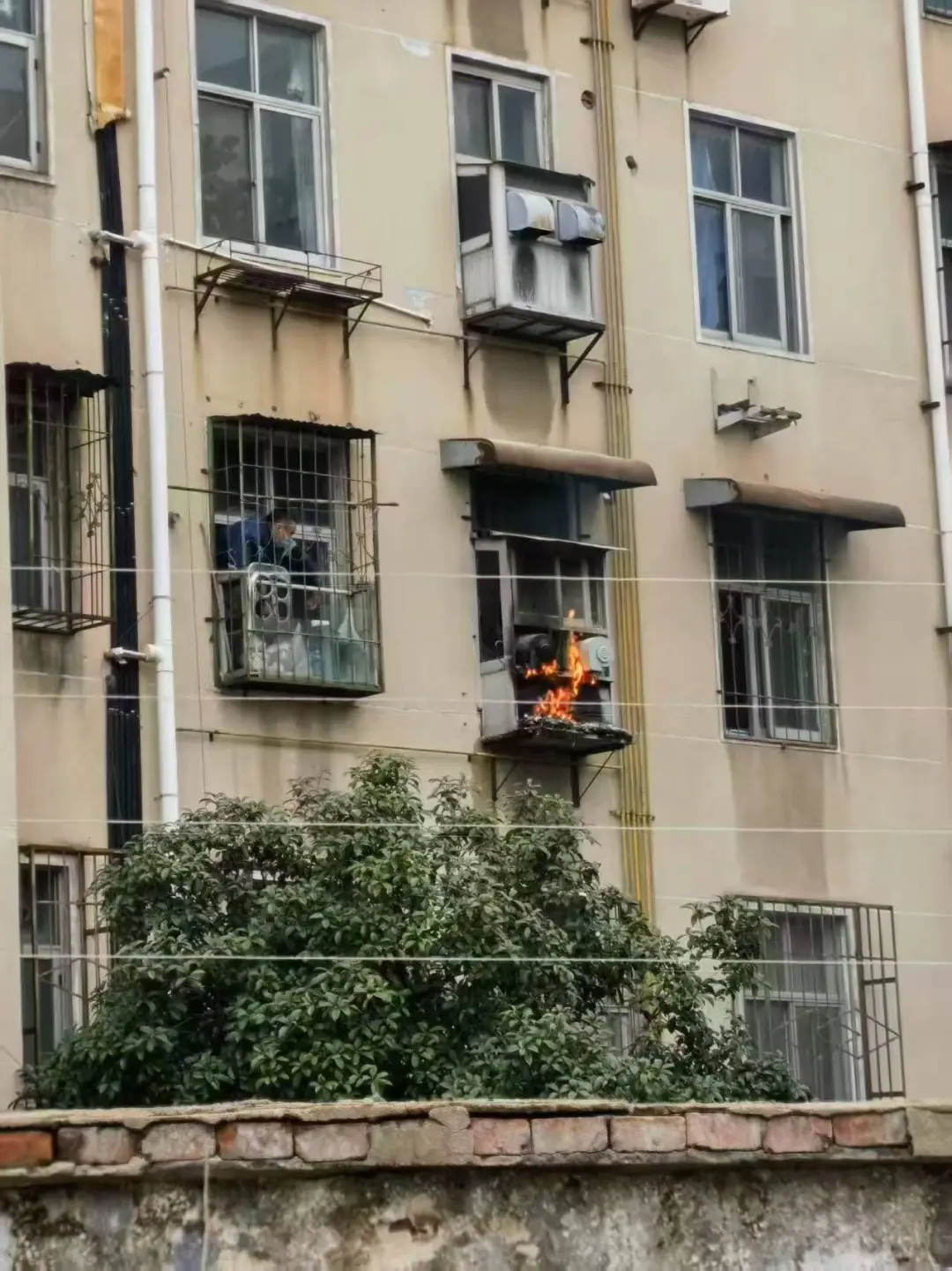 濃煙四散,航天科工九院紅陽公司廠區與該居民樓僅一墻之隔,運輸管理部梁部長發現火情后,立刻召集人手。3分鐘內,8名職工、8瓶干粉滅火器準備就緒,眾人一同奔赴現場。