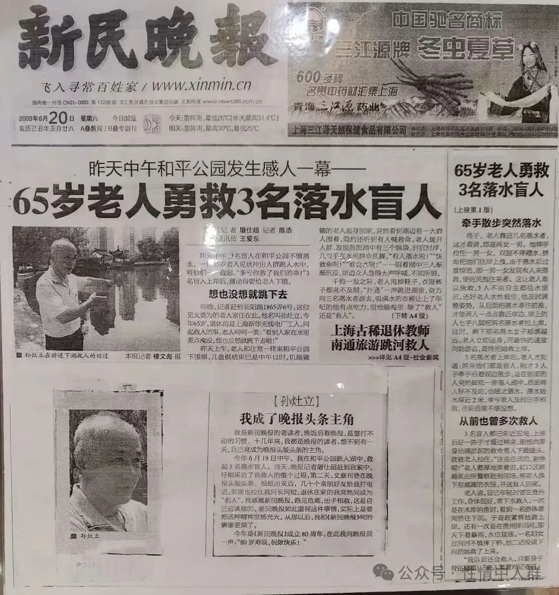 這已是孫灶立第二次水中救人。早在2009年,時(shí)年65歲的他就在上海和平公園,從2米多深的湖中成功救起三名落水的盲人,事跡獲《新民晚報(bào)》等媒體廣泛報(bào)道。從花甲到耄耋,歲月流轉(zhuǎn)不改英雄本色,兩次義舉映照赤誠初心。