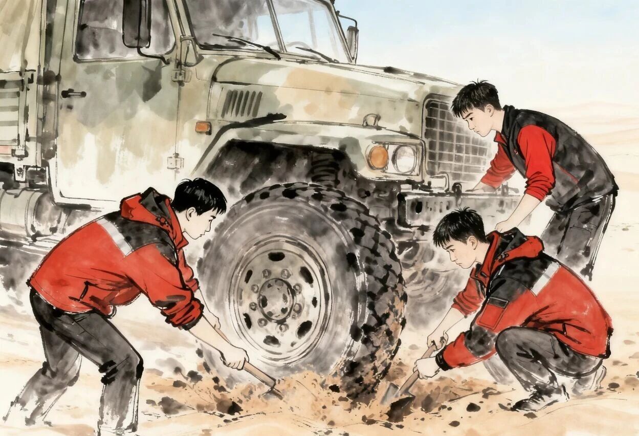 大家輪班接力,經(jīng)過數(shù)小時的奮戰(zhàn),深陷的車輪終于露出足夠的受力空間,緩緩駛出沙坑,奔赴目的地。